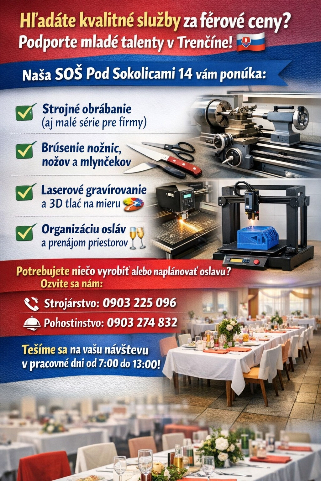 SOŠ, Pod Sokolicami 14, Trenčín, ponúka možnosť uskutočnenia spoločenských podujatí pohostinného charakteru ako sú rodinné oslavy, kar, svadby, krstiny, školenia a stužkové slávnosti.
